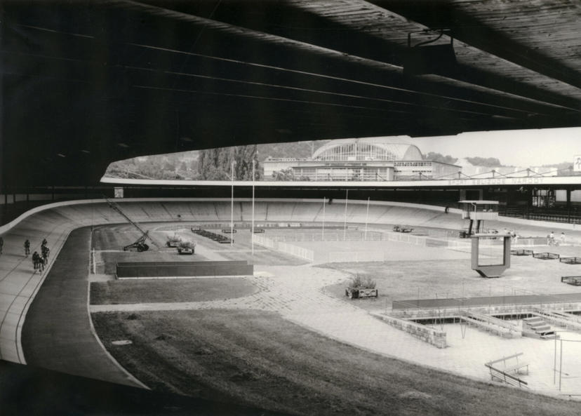 Mezi roky 1957 a 1962 bylo kromě nové betonové dráhy, která dle oficiálního měření činovníky UCI čítala 410,18 metrů, vystavěno také nasypané hlediště, prkenná bariéra s betonovými sloupky a obrubníkem mezi hledištěm a dráhou, provizorní obvodová komunikace na vnější straně svahu hlediště, uvnitř areálu betonový parket 30x20 m sloužící pro kolovou a krasojízdu a 10 boxů pro závodníky, rozhlasová a kontrolní věž, první budova šaten na východní straně areálu, kam se také z protilehlé strany přesunula startovní čára, budova pro uchování jízdních kol, budova pokladen, ozvučení stadionu a také se zmodernizovalo osvětlení jízdní dráhy, kdy vysoké sloupy v hledišti byly nahrazeny vhodnějším řešením se stožáry s dvouramennými výložníky s převisem nad samotnou jízdní dráhu.